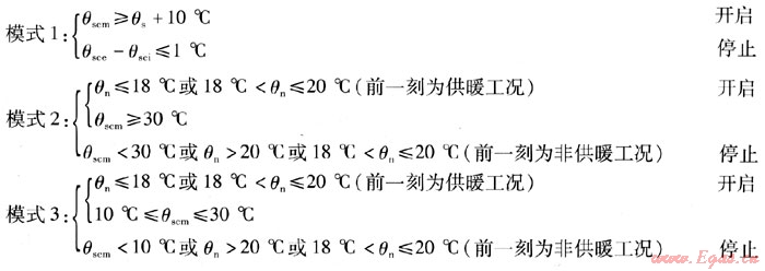 ③ 模式3:太陽能熱泵供暖。供暖過程中,當太陽輻射較強時,集熱器內介質的溫度不能滿足直接供暖的要求,但可以滿足熱泵供暖的要求。閥門7、11、14、9、4、1、12、15開啟,其余關閉。