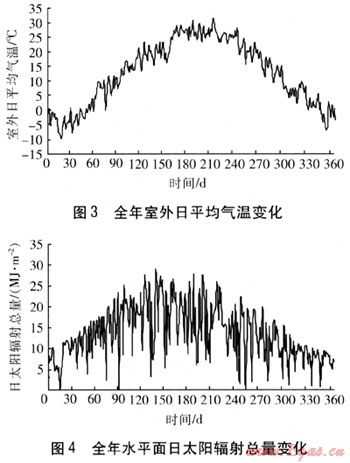 在模擬分析中,采用中國氣象局氣象信息中心提供的建筑熱環境氣象數據集中北京地區典型年的氣象數據[12]。全年室外日平均氣溫及水平面日太陽輻射總量見圖3、4。由圖3、4可知,在非供暖期,室外溫度較高,太陽輻射較強,可以把這部分太陽能儲存到地下坑槽中,供暖期再用熱泵提取,進行供暖。在供暖期,太陽輻射與建筑熱負荷在時間上不同步,供暖初期和末期,太陽輻射較強,室外平均溫度較高,熱負荷較小;供暖中期,室外平均溫度較低,熱負荷較大,太陽輻射較弱。因此,在供暖初期和末期,優先利用集熱器收集的太陽能供暖,減少熱泵的耗電量,提高系統的性能。