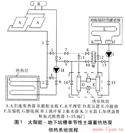 太陽能-地下坑槽季節性土壤蓄熱熱泵供熱系統流程見圖1。