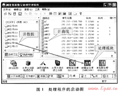 處理程序在設計時,應用了Windows系統的拖放功能實現對數據的調度,只要將井數據拖到相應處理模塊圖標上,則可應用該模塊進行處理(圖1)。