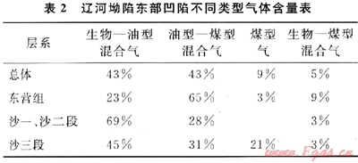 上式中V油、V煤分別代表混合氣中偏陸源油型氣和煤型氣的含量百分數。通過公式可計算得出東部凹陷不同層段的天然氣的混合比例(表2)。