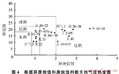 將據該區異庚烷值和庚烷值判斷的天然氣成熟度(圖4)
