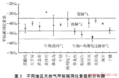 總體看,該區大部分天然氣含量有較大差異,說明該區存在明顯的運移作用過程。 依據天然氣甲烷碳同位素值及干燥系數對天然氣的成熟度進行估算,該區絕大多數樣品處于成熟階段,主要屬于熱解氣。但在黃沙坨及葵花島地區,其天然氣的成熟度相對比較高,已經達到了裂解氣的階段。因而可依據天然氣的甲烷同位素值對各個地區天然氣的演化階段進行劃分,主要屬于熱解氣。