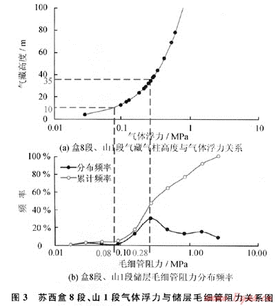 研究區區域構造平緩,通過對大量盒8段、山1段氣藏剖面統計,滲透性好、橫向連通好的氣層連續高度主要分布在10~35m,一般不超過40m。根據上述公式計算得研究區盒8段、山1段氣藏天然氣向上浮力介于0.08~0.28MPa。