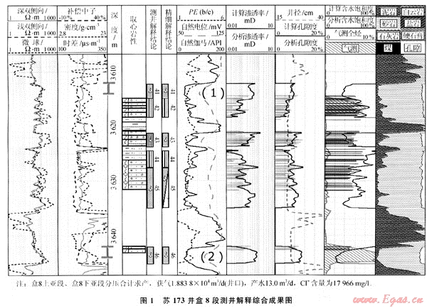 所示,研究區內蘇173井盒8段氣層1和氣層2射孔段分別為3612.0~3614.0m、3642.0~3644.0m,兩段分壓合求,試氣獲井口產量1.8838×104m3/d,產水13.0m3/d。研究區試氣出水井基本都呈現出高阻的特征,給測井識別氣、水層帶來了很大網難。