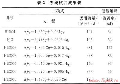 應用壓力恢復、壓降、系統試井和一點法等多種試井方法研究儲層物性及產能特點。確定了各氣井較為真實可靠的產能方程(表2),為新井配產提供了依據;同時,運用三維建模和數值模擬技術,確定了合理井距為1400m,為實現稀井高產創造了條件。