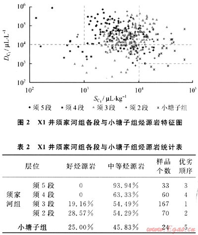 據此X1井須5段烴源巖以C類為主;須4段以C類、B類為主;須3段以8類為主,少部分偏C類和A類;須2段以A類為主,少部分偏C類和B類;小塘子組以A類為主,見圖4(圖中SC2~5表示酸解烴重烴含量)。