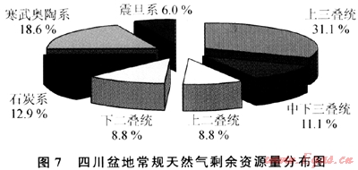 四川盆地天然氣資源豐富,盆地天然氣資源量為10.6×1012m3,按盆地現有探明儲量計算,探明率僅19.5%。隨著新技術推廣應用和認識深化,盆地二疊系長興組、三疊系飛仙關組礁灘以及三疊系須家河組勘探相繼獲得重大突破,資源量還將有較大增長,資源潛力很大。從待發現資源分布來看,以上三疊統為最多,占31.1%;其次為中下三疊統-上二疊統,占19.9%(圖7)。此外,四川南部地區下古生界海相頁巖氣資源豐富,初步估算寒武系筇竹寺組和志留系龍馬溪組頁巖氣資源量在4×1012m3以上。這些領域都是四川盆地下一步勘探開發的重點,也是盆地天然氣持續上產的重要方向。