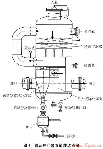 從油田伴生氣加工裝置實際運行狀況和設備內沉積污垢(油泥)的情況分析來看,油田伴生氣中的液體(油、水)含量較高,而天然氣加工工藝條件要求系統阻力小,對于氣負荷較大、壓力較低、雜質顆粒小的油田伴生氣加工,普通及單一的分離技術難以達到工藝生產要求,需要研制出一種結合了重力沉降、離心分離及過濾多級分離技術的組合凈化裝置。