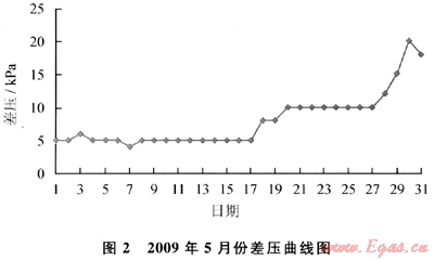 試驗裝置連續平穩運行前4個月,進出口差壓變化很小,一直在5kPa以內,每天平均排放液體約80kg。2009年5月19日起試驗裝置進出口差壓開始增高,5月30日達到20kPa,差壓曲線圖如圖2所示,已超出15kPa的設計監控值,但還沒影響到壓縮機的正常運行。2009年6月5日更換了試驗裝置中的4#凈化器的濾料,經分析,試驗裝置進出口壓差突然增高的原因是高效氣體(深層)過濾器內的中空纖維濾料吸收液態雜質達到飽和所致。