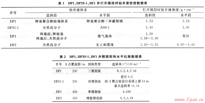 6) 調整了A點靶前距,有效降低DF2井鉆遇煤層段長。造成DF1井兩次埋鉆事故原因主要有以下幾個方面:①打開煤層時鉆井液密度不足以平衡煤層的垮塌應力(表1為DP1井、DP35-1、DF1打開煤層時鉆井液密度數據);②DF1造斜段煤層垮塌時采用倒裝鉆具組合,滑動鉆進后變復合鉆進時,由于鉆具撓動敲打,誘發煤層大量坍塌,造成突然坍塌埋鉆;③DF1井為長半徑水平井,A點靶前位移大,造斜率小,穿越煤層段長,累計煤層厚43m,單層最大厚度為25m(表2為DP1井、DP35-1、DF1、DF2井造斜段造斜率數據)。