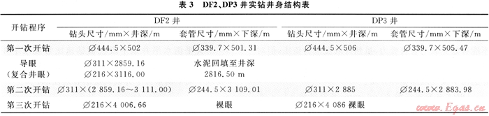 DF2、DP3井采用第三次開鉆井身結構,Φ339.7mm表套進入中下侏羅統直羅組,封住上部膠結強度低、疏松、易垮塌地層,第二次開鉆采用Φ311mm鉆頭,下入Φ244.5mm技術套管封住造斜段。第三次開鉆采用Φ215.6mm鉆頭,為下步完井方式的選擇留有余地,如果獲得理想的自然產能則裸眼完井,若自然產能低先進行氣舉、解堵,解堵后仍不能達到配產要求,可以下5½″尾管射孔完井,對儲層實施壓裂改造[5]。這樣既降低了施工風險,又避免了小井眼中實施壓裂改造在工具上的局限性。鉆井實踐結果表明,這種井身結構是合理的,其結構簡單、施工方便,具有可操作性和經濟性。DF2、DP3井實鉆井身結構如表3所示。