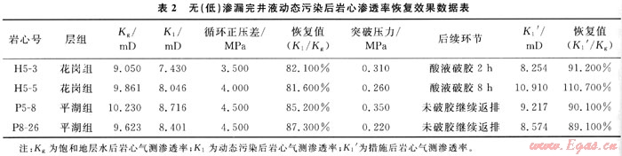 滲透率恢復值為120~130,但有沉淀、分層和絮凝,說明與地層水的配伍性良好。但是為考察無(低)滲漏完井液體系在高溫作用下的保護儲層效果即巖心滲透率恢復值情況,選取目標層4塊巖心進行完井液動態污染實驗,實驗溫度為120~130℃,動態循環正壓差為3.5~4.5MPa,實驗數據見表2。
