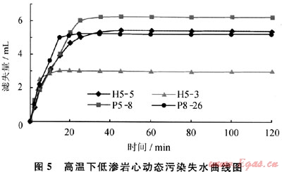 濾失性無(低)滲漏完井液體系在動態污染試驗的前20min,5塊巖心動態失水速率普遍較大,這可能是因為軟顆粒狀完井液受擠壓時發生的物理脫水現象,但總量均沒有超過7mL。20min左右,致密的碳化膠質暫堵層逐漸形成,加上軟顆粒本身的物理暫堵功能,雙重暫堵下巖心基本不再發生濾失(圖5),說明無(低)滲漏完井液高溫下與巖心接觸時發生的化學質變有利于控制完井液的失水滲漏。從濾失量減少為0的時間可看出,膠質暫堵層在120~130℃下形成的時間在20min左右,最低的約6min,如H5-3號巖心,6min左右濾失量就降至為0,這可能與巖心中的黏土礦物類型和總含量有關。