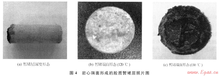 從表2中實驗數據可知:低滲巖心自然反排的突破壓力較低,均小于0.4MPa,滲透率恢復值均超過80%,如果反排時間繼續延長,巖心滲透率恢復值還可繼續得以恢復,無(低)滲漏完井液所形成的暫堵層完全可以自然解堵,在完井和修井結束后,無論采用連續油管或氣舉都很容易誘噴解堵。用酸液破膠后,巖心的滲透率恢復值會繼續增加,甚至可超過100%,但對于低滲透氣藏,為減少液相部分滯留而造成水相圈閉損害,不推薦采用酸液破膠。另外,實驗中有了新發現:巖心端面在高溫下形成了一種黃至黑色膠質致密暫堵層,有一定強度,不能用手輕易刮開,深度約3mm(圖4-a),且隨著實驗溫度增加暫堵層顏色加深(圖4-b、c),認為是有機高分子完井液在接觸巖心時發生碳化(熱催化)反應所得,這與新型完井液體系的構建思路基本一致。