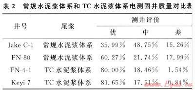 TC柔性水泥漿體系在蘇丹6區7口井的Φ244.5mm中間套管固井中得到了成功應用,聲波測井結果為:優質率平均提高30%以上,不合格率平均下降了15%。表2是蘇丹6區采用常規水泥漿體系和TC水泥漿體系封固Φ244.5mm套管的固井質量對比結果,分別取自各井完井前CBL電測評價資料,數據顯示應用TC柔性水泥漿體系后固井質量顯著提升。