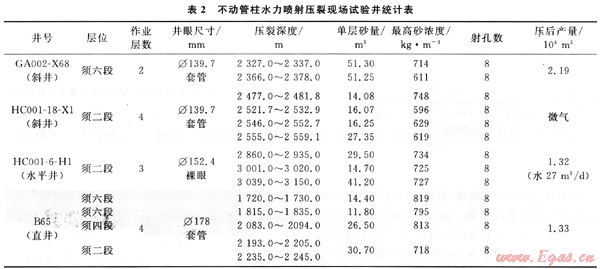在前期大量有效研究的基礎(chǔ)上,共完成了4口井的現(xiàn)場(chǎng)試驗(yàn)。試驗(yàn)結(jié)果表明:目前已經(jīng)形成了井深3000m以?xún)?nèi)的不動(dòng)管柱水力噴射壓裂工藝及配套技術(shù);研制的井下工具工作壓力達(dá)到60MPa、工作溫度達(dá)到90℃,在Φ178、Φ139.7mm兩種套管和Φ215.9、Φ152.4mm兩種裸眼使用。試驗(yàn)井實(shí)現(xiàn)不動(dòng)管柱壓裂3~4條縫,單縫壓裂成功率100%。返排后,投產(chǎn)順利,其中HC001-6-H1井實(shí)現(xiàn)了3段合采,865井實(shí)現(xiàn)了3層(4段)合采(表2)。