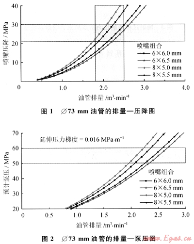 在綜合考慮了噴嘴壓降和井口泵壓的條件下,選擇油管注入排量2.2m3/min,此時(shí)泵壓為66.9MPa,基本上是井口不超壓的前提下可達(dá)到的最高排量。