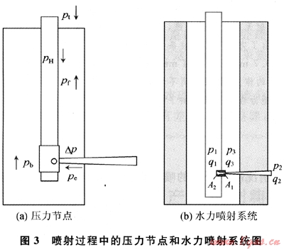 按照節(jié)點(diǎn)方法來(lái)分析,涉及井下壓力節(jié)點(diǎn)的有以下幾個(gè)(圖3-a):①裂縫延伸壓力(pp);②噴嘴前井底壓力(pb);③管路摩阻(pf);④靜水柱壓力(pH);⑤井口泵壓(pt)。