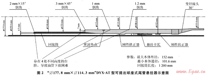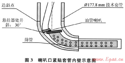 3) 目前尾管懸掛器座掛位置一般位于井斜30°左右處。因此,油管喇叭口在經過該井段時其端面勢必緊貼套管內壁,致使無法順利進入懸掛器回接筒內(圖3)。