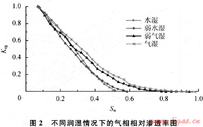 圖2給出了不同潤濕條件下的氣相相對滲透率曲線。在每一飽和度下,水濕巖樣的氣相相對滲透率總比氣濕巖樣的氣相相對滲透率低很多,這給出了一個可在油田應用的潛在方法:對致密氣藏,改變近井地帶的潤濕性,使其由水濕變為氣濕,可以增加氣體的滲流能力,提高產量或注入量。值得注意的是,當水飽和度大于0.4時,氣體的相對滲透率按照水濕→弱水濕→弱氣濕→氣濕的順序依次增加;但當水飽和度小于0.4時,相對滲透率增加的次序性被打亂,在弱水濕情況下表現為最小。