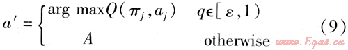 設(shè)當(dāng)前狀態(tài)πj={a1,a2,a3,…,aj}下螞蟻k位于節(jié)點(diǎn)j,螞蟻將按照ε-貪婪規(guī)則確定在節(jié)點(diǎn)j′要選擇的行為a′,即以概率1-ε按貪婪策略選取當(dāng)前狀態(tài)下最大Q值對(duì)應(yīng)的行為。而以概率ε隨機(jī)選擇一個(gè)當(dāng)前狀態(tài)下允許行為的表達(dá)式為: