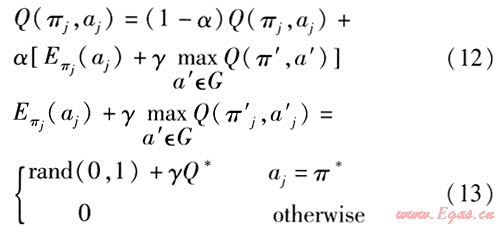 假設(shè)信息素模型(包括信息素更新規(guī)則、強(qiáng)化信號(hào)等)和狀態(tài)轉(zhuǎn)移規(guī)則均未知,則對(duì)所優(yōu)化問題的每一個(gè)節(jié)點(diǎn)j都賦以Q值(行為一狀態(tài)對(duì)),用Q值取代螞蟻信息素作為決策信息,通過對(duì)Q函數(shù)變化規(guī)律的學(xué)習(xí)不斷逼近最優(yōu)策略。
