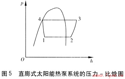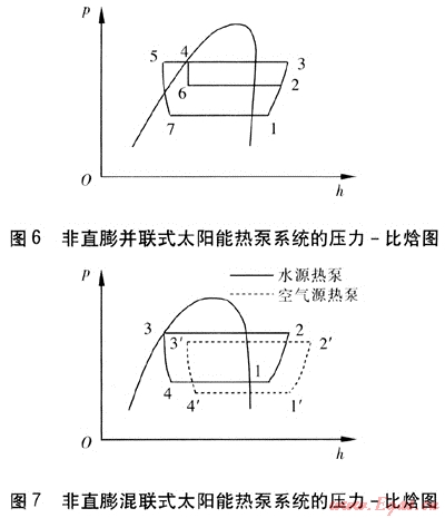 直膨式、非直膨并聯式、非直膨混聯式太陽能熱泵系統的壓力-比焓(p-h)圖見圖5~7。由圖5可知,在直膨式太陽能熱泵系統中,由冷凝器出來的工質經過膨脹閥節流(4-1)后到達太陽能集熱器,吸收太陽能后氣化(1-2),再進入壓縮機壓縮后變為高溫高壓的氣體(2-3),最后進入冷凝器放熱(3-4)。