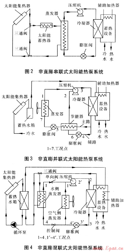 串聯式:在非直膨串聯式太陽能熱泵系統中,經太陽能集熱器加熱的熱水經過太陽能蓄熱器,再流經熱泵的蒸發器。當太陽能輻射不足時,蒸發器中出來的冷水經過太陽能蓄熱器,吸收熱量后再進入蒸發器。