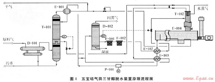 五寶場氣田三甘醇脫水裝置在設計中采用了先進的齒輪泵、高效的波紋板式換熱器,簡化了脫水工藝流程,降低了脫水裝置的能耗,減少了脫水裝置投資和運行成本。