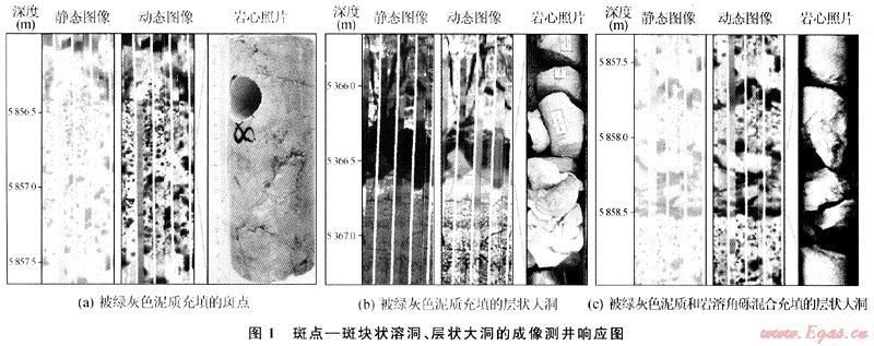 此類溶洞外形呈等軸狀,但尺寸較小,單個溶洞的直徑一般從2mm~20cm不等,其中規模較小者(2mm~2cm)在巖心或成像測井圖像上表現為小斑點;規模較大者(數厘米至20cm)則呈斑塊狀。未充填、半充填或充填溶洞均有分布,但多數溶洞被綠灰色巖溶泥質沉積物等充填。一般成群、成帶產出,沿孔滲條件較好的顆?;規r層內發育(圖1-a),或沿層理、裂縫、縫合線及方解石脈等呈線狀或串珠狀分布,表現出一定程度的組構選擇性。在成像測井圖像上,未充填或泥質充填的斑點一斑塊狀溶洞一般表現為暗色高導斑點或斑塊,與碳酸鹽圍巖亮色高阻顯示形成鮮明的反差,易于識別(圖1-a)。