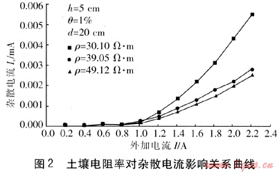 在上述條件下,埋地深度對雜散電流影響關(guān)系曲線見圖3。由圖3可知,在其他實驗條件不變的情況下,隨著金屬管道埋地深度的增加,在外加電流相同情況下,金屬管道內(nèi)的雜散電流逐漸減小,并且減小的幅度隨著埋地深度的增加也逐漸減小,即在一定條件下,金屬管道的埋地深度存在著一個極限值,當(dāng)埋地深度大于這個極限值時,雜散電流基本保持不變。