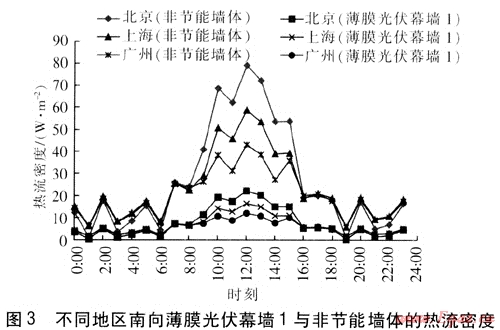 以北京、上海、廣州為例,北京θo,av,取28.6℃,θo,dr,取33.2℃;上海θo,av取30.4℃,θo,av取34℃;廣州θo,av取30.1℃,θo,dr取33.5℃。經計算可得,不同地區南向薄膜光伏幕墻1與非節能墻體的熱流密度見圖3。由圖3可知,這3個地區墻體熱流密度最高值均出現在12:00左右。經計算可得,對于這3個地區,非節能墻體結合薄膜光伏組件后的節能率可達72%。