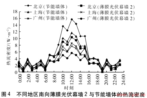 經計算可得,不同地區南向薄膜光伏幕墻2與節能墻體的熱流密度見圖4。相比薄膜光伏幕墻1,節能墻體結合薄膜光伏組件后的節能率較低,經計算得,節能率可達34%。