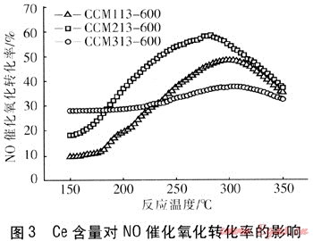 針對(duì)NO催化氧化的重要性,國(guó)內(nèi)外學(xué)者開(kāi)展了積極的研究,其中以貴金屬Pt、Pd催化劑的轉(zhuǎn)化效率較高,300℃時(shí)轉(zhuǎn)化率接近90%[7~9]。我國(guó)貴金屬資源相對(duì)匱乏且造價(jià)高昂,主要用于汽車尾氣處理,而大型煙氣處理裝置則難以實(shí)現(xiàn)。近年來(lái),以過(guò)渡金屬為活性主體的新型催化劑引起了國(guó)內(nèi)外學(xué)者的重視,并進(jìn)行了大量研究[10~12]。我國(guó)的稀土儲(chǔ)量位居世界第一,將各類稀土元素應(yīng)用于催化領(lǐng)域已有大量報(bào)道,其中以La、Ce應(yīng)用較多。以CeO2為例,由于其強(qiáng)大的儲(chǔ)存和釋放氧的能力,已被應(yīng)用到多個(gè)催化方向(如CO催化氧化)[13]。