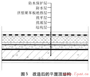 對于占17.5%的平屋頂,通常采用的絕熱措施是將熱導率小、吸水率低并具有一定強度的輕質絕熱材料設置在防水層與找平層之間。改造后的平屋頂結構見圖5。改造后不僅能夠有效控制屋頂傳熱系數,而且能使結構層受到保護而不致受到過大的溫度應力,避免結構層內表面結露甚至結凍。