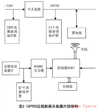 GPRS遠傳數(shù)據(jù)采集器是遠程抄表系統(tǒng)的重要設備,數(shù)據(jù)采集器具有RS485/232接口,通信速率為300~115200bps,通信協(xié)議采用MODBUS RTU/ASCⅡ工業(yè)通信協(xié)議,內部供電一般選擇24VDC。一只數(shù)據(jù)采集終端(DTU)實際應用中一般接1-3只燃氣表。標準GPRS遠程數(shù)據(jù)采集器內部結構如下: