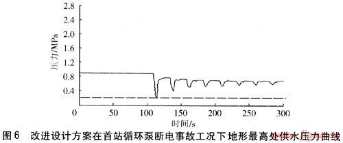 由圖6可知,在首站循環泵斷電事故工況下,地形最高處的供水壓力高于飽和蒸汽壓力,供熱介質不會發生汽化。動態水力分析表明,以較高的供水溫度減小供熱介質流量,以及提高壓力水平,可以在系統出現事故工況時,保證供熱系統安全運行。