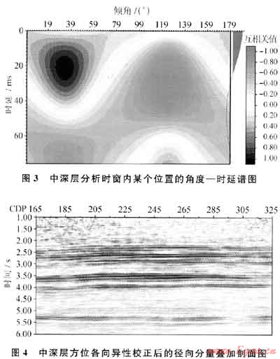 圖1為淺層分析時窗內某個CDP位置的角度一時延圖,從圖1中可以看出,該位置的各向異性方向約90°(即東西方向),快慢橫波時差超過40ms,表明淺層各向異性特征明顯。圖2是淺層方位各向異性校正前后的徑向分量疊加剖面對比,從圖2中可以看出,經過方位各向異性校正后的剖面的連續性得到了較大的提高,有效反射得到了加強,成像質量得到了明顯的改善。與此同時,淺層分析時窗以下的徑向分量數據的能量也發生了變化,說明各向異性具有“傳遞”作用,上層的各向異性會影響下層。