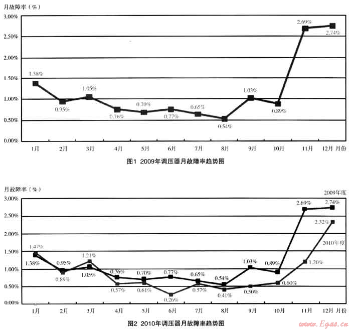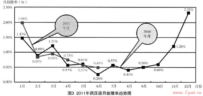 以下是2009年~2011年6月調壓器故障率的統計數據:(如圖1~圖3)西安因冬季采暖鍋爐客戶較多,每年用氣波峰比為4:1,冬季由于上游的原因,經常出現供不應求的現象,中壓管網的供氣壓力和流量達不到設計要求,處于低壓高流速的運行狀態,管道內的粉塵會被帶到下游,對調壓器的正常運行帶來一定的影響。故公司在設定調壓器故障率KPI指標時,對冬季高峰供氣期間與平時有所不同,即每年4月~10月調壓器故障率不大于1.5%,11月~次年3月調壓器故障率不大于3%。