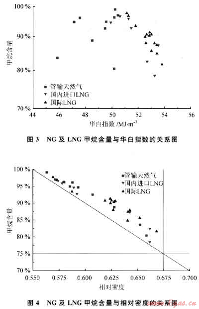 同樣,限定相對密度的范圍與限定甲烷的最低含量具有同樣的功效。甲烷值和辛烷值有非常確定的關系,是抗爆燃的重要參數。圖3、4分別給出了甲烷含量與華白指數和相對密度的關系。