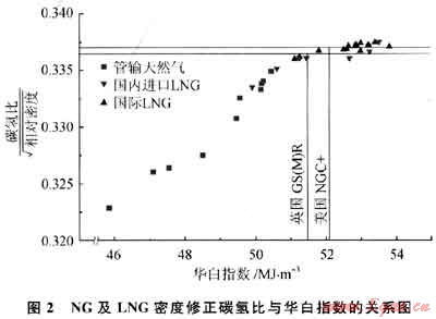 對華白指數限定范圍的控制是天然氣利用的安全性、環境排放和效率的保證。燃氣的碳氫比數決定了不完全燃燒指數的大小或燃燒的C0排放量。圖2給出了相對密度修正的碳氫比和華白指數的關系。由此可見控制華白指數范圍與控制碳氫比的變化一樣,具有限定不完全燃燒指數或黃焰指數的同樣功效。圖2中GS(M)R是英國燃氣安全管理規范“Gas Safety(Management)Regulations”的縮寫。