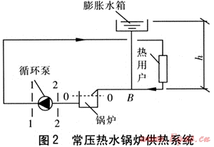 常壓鍋爐在運行中不承受壓力,即鍋爐表壓為0,常壓熱水鍋爐供熱系統見圖2。在系統中,循環泵位于鍋爐出口,即供水干管始端,點B為系統定壓點。