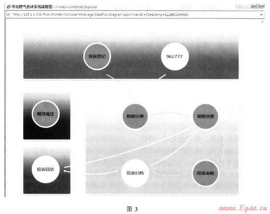 由于每條投訴信息均規定了統一的處理流程,因此,我們可以通過系統查詢某條信息正處于投訴處理的哪個階段,并以不同顏色予以區分,其中,綠色表示已經通過的階段,白色表示尚未完成的階段,并且,某條投訴若上級或領導作過批注,則以紅色表示,具體如圖3所示: