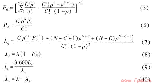 M/M/C/N/∞系統屬于典型的單隊對多坐席(并列)情形,其概率分布符合泊松-負指數類型,其中顧客按泊松流輸入,服務時間服從負指數分布。服務規則是先到先服務,系統中能容納的最大顧客數為N,當顧客到來系統而系統容納不下時,則顧客自動離去。