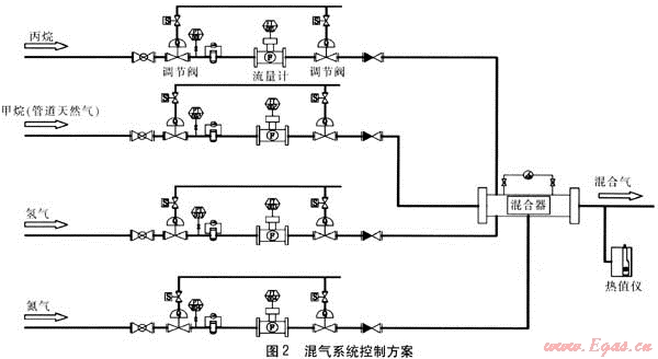 對于上述標準氣體,除組成外,更關心的是熱值,故在混合器出口設置熱值儀來檢測制取的標準氣體的熱值[5]。同時將檢測到的熱值反饋至控制系統,對混氣比例進行微調,使整個控制系統成為閉環系統。