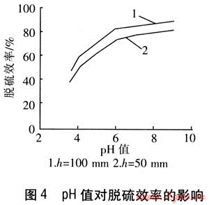 脫硫劑pH值是影響脫硫效率的一個重要參數,也是脫硫過程中可調的參數。選擇適當的pH值,不僅能夠保證足夠高的脫硫效率,還可以降低運行成本,保證脫硫系統的穩定運行。實驗選擇的石灰脫硫劑體積分數為10%;h為高液位溢流管管口距沖擊管出口的距離,分別取50、100mm;低液位溢流管管口距沖擊管出口的距離為20mm。脫硫劑pH值對脫硫效率的影響見圖4。由圖4可知,脫硫劑pH值為3.8~6.0時,脫硫效率隨pH值的增加變化較快;pH值>6時,脫硫效率變化緩慢。h=100mm時,噴射速度提高,引射的液量增加,鼓泡通過液層的高度和運動的距離增加,氣液交換的時間延長,脫硫效率較高,阻力隨之增大。