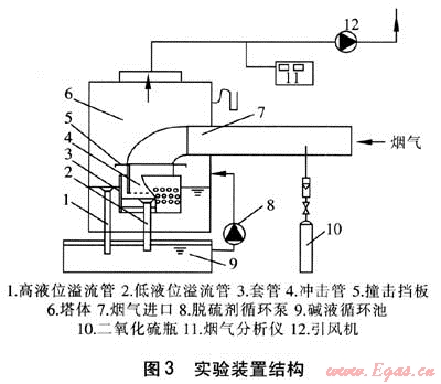 以石灰漿液為脫硫劑的雙液位噴射鼓泡煙氣脫硫除塵實驗裝置結構見圖3,模擬煙氣垂直進入沖擊管在出口處卷吸液體向上流動,此過程中煙氣被加濕冷卻,煙氣中的二氧化硫和煙塵與脫硫劑接觸被吸收和去除。經除塵和脫硫后的煙氣轉向向上流動,在撞擊擋板作用下水霧被分離,凈化后的煙氣由引風機排出。脫硫劑循環泵將脫硫劑不斷補入塔內以保證塔內液位,正常工作時脫硫劑通過高液位溢流管進行循環。調整二氧化硫瓶的閥門,可以改變二氧化硫濃度,通過測壓管可以測得在不同煙氣流量下的裝置阻力。煙氣分析儀可以測出煙氣中二氧化硫濃度的瞬時值和積分值。實驗規模:模擬煙氣量200~1000m3/h,煙氣進口處二氧化硫質量濃度700~850mg/m3,空塔流速1~3m/s。