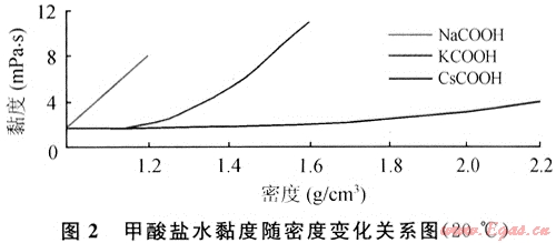 甲酸鈉、甲酸鉀、甲酸銫這3種鹽水的黏度隨密度的變化關系[2]如圖2所示。