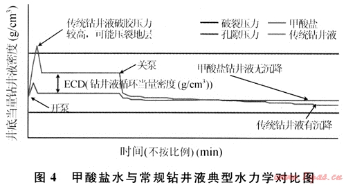 甲酸鹽鉆井液最大限度地降低了開泵時的瞬時峰壓、起下鉆時的抽汲激動壓力和循環壓力損失。Huldra A4井和A4ST井的循環當量密度比較見表5,甲酸鹽水鉆井液與常規鉆井液典型水力學對比(圖4)。